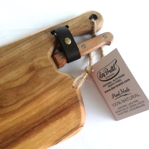 Schneidebrett Mod. Alpen Home aus Nussholz (40 x 17,5 x 1,8 cm) – 1 Stk.; Messer mit feststehender Klinge aus Edelstahl mit Griff aus Buchenholz (22 x 2 cm) – 1 Stk.; Fixierband aus echtem Leder (17,5 x 2 cm) – 1 Stk.