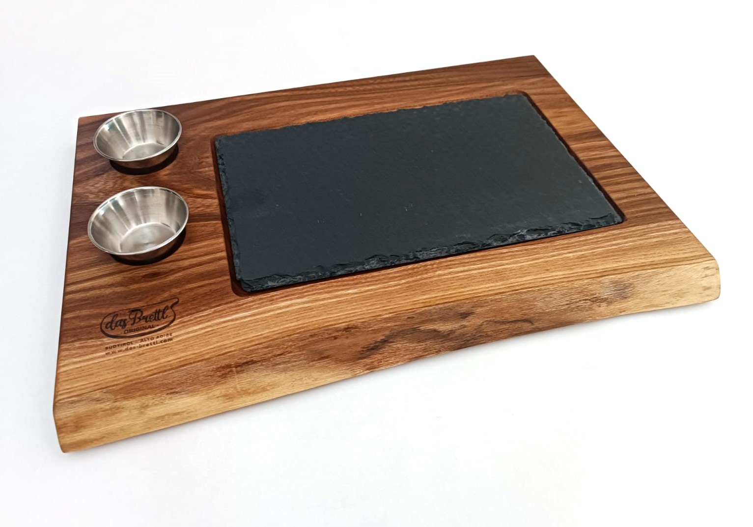 Mod. Corvara, Servierbrett aus Ulmen-Baumholz, hochqualitatives Massivholz, handgefertigt, mit Schieferplatte und 2 Schalen.