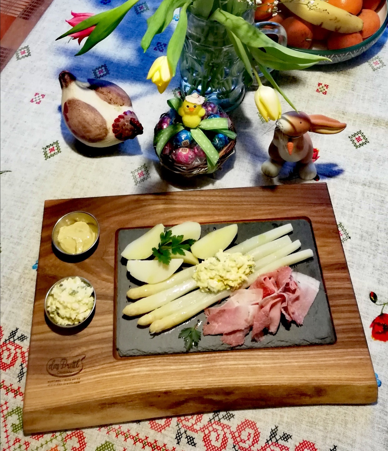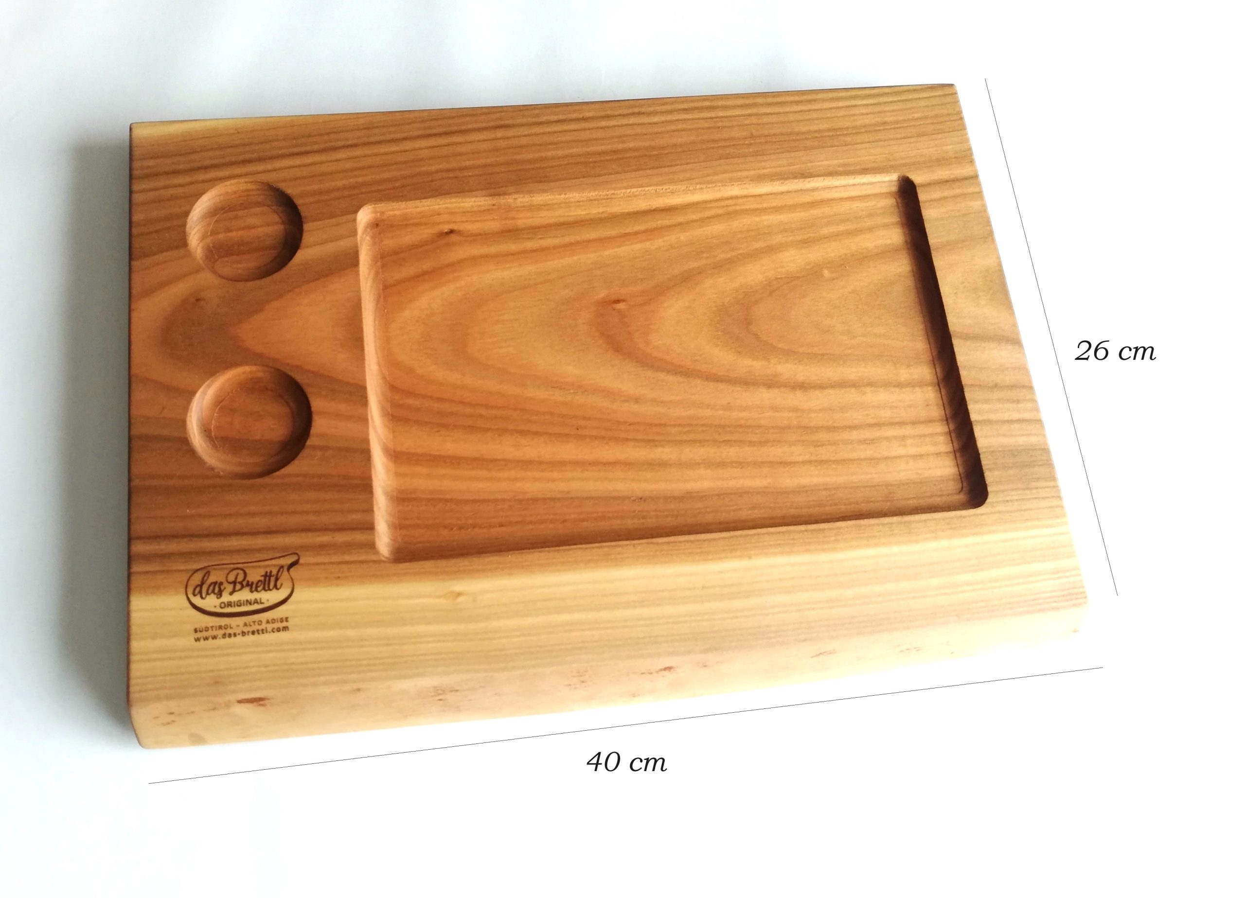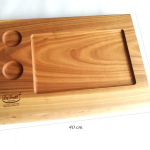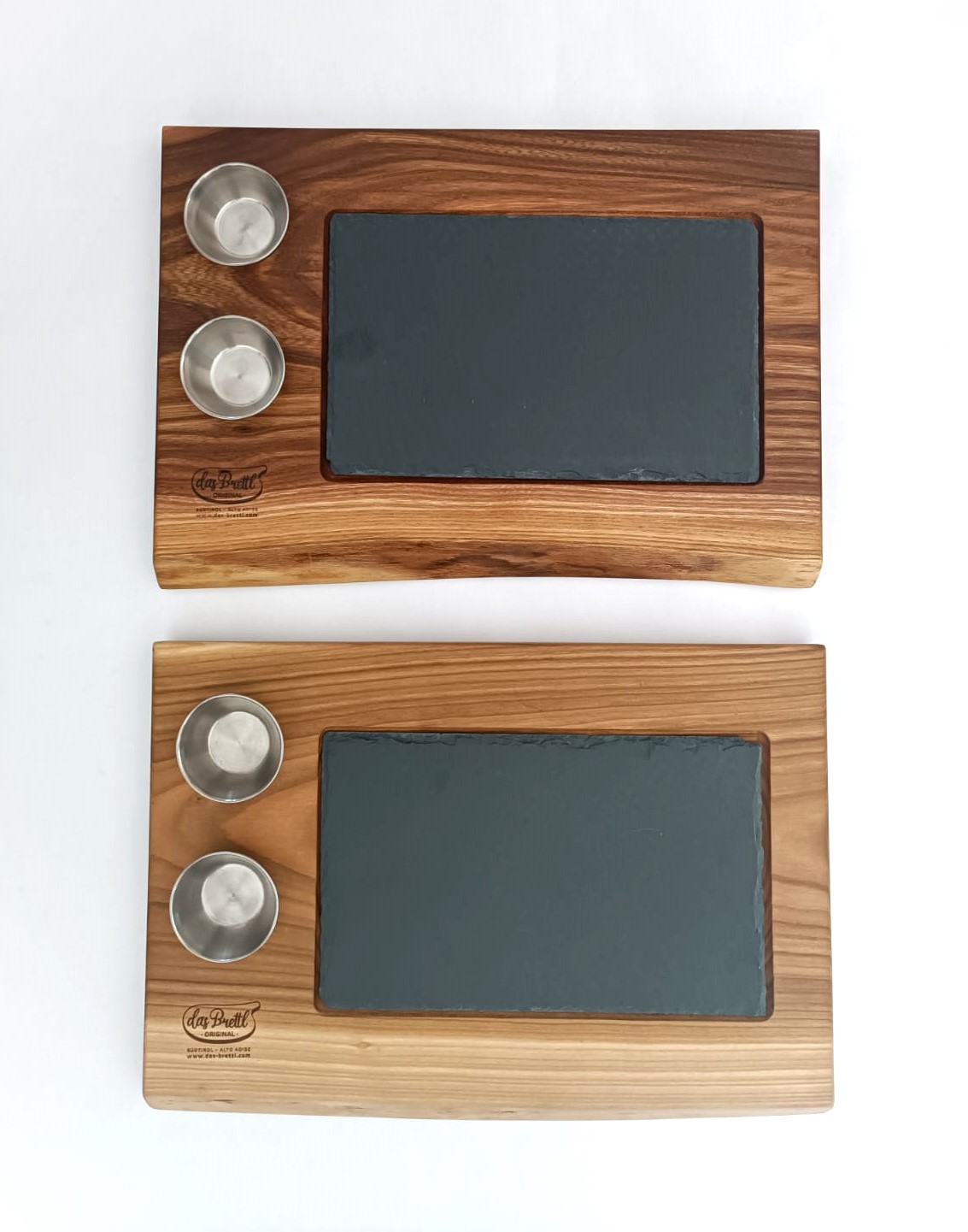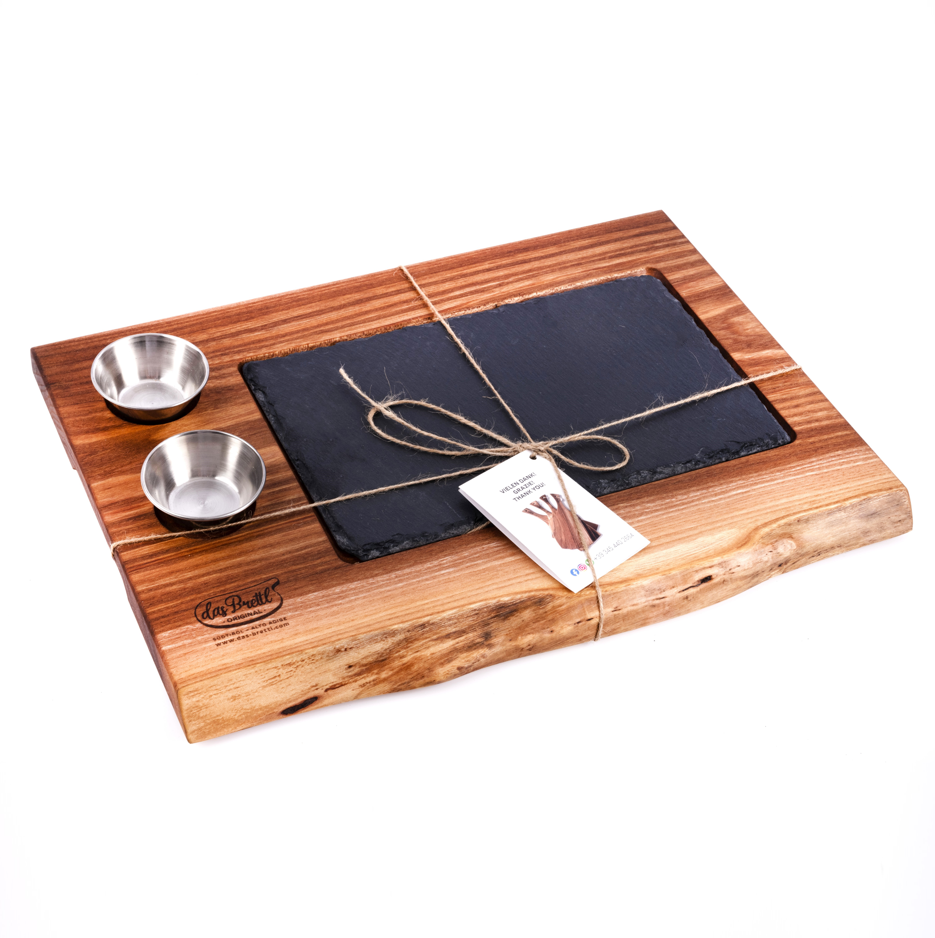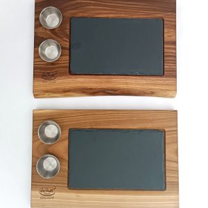 Mod. Corvara, tagliere da portata in olmo massello di alta qualità, fatto a mano, con un inserto di ardesia e 2 ciotole.