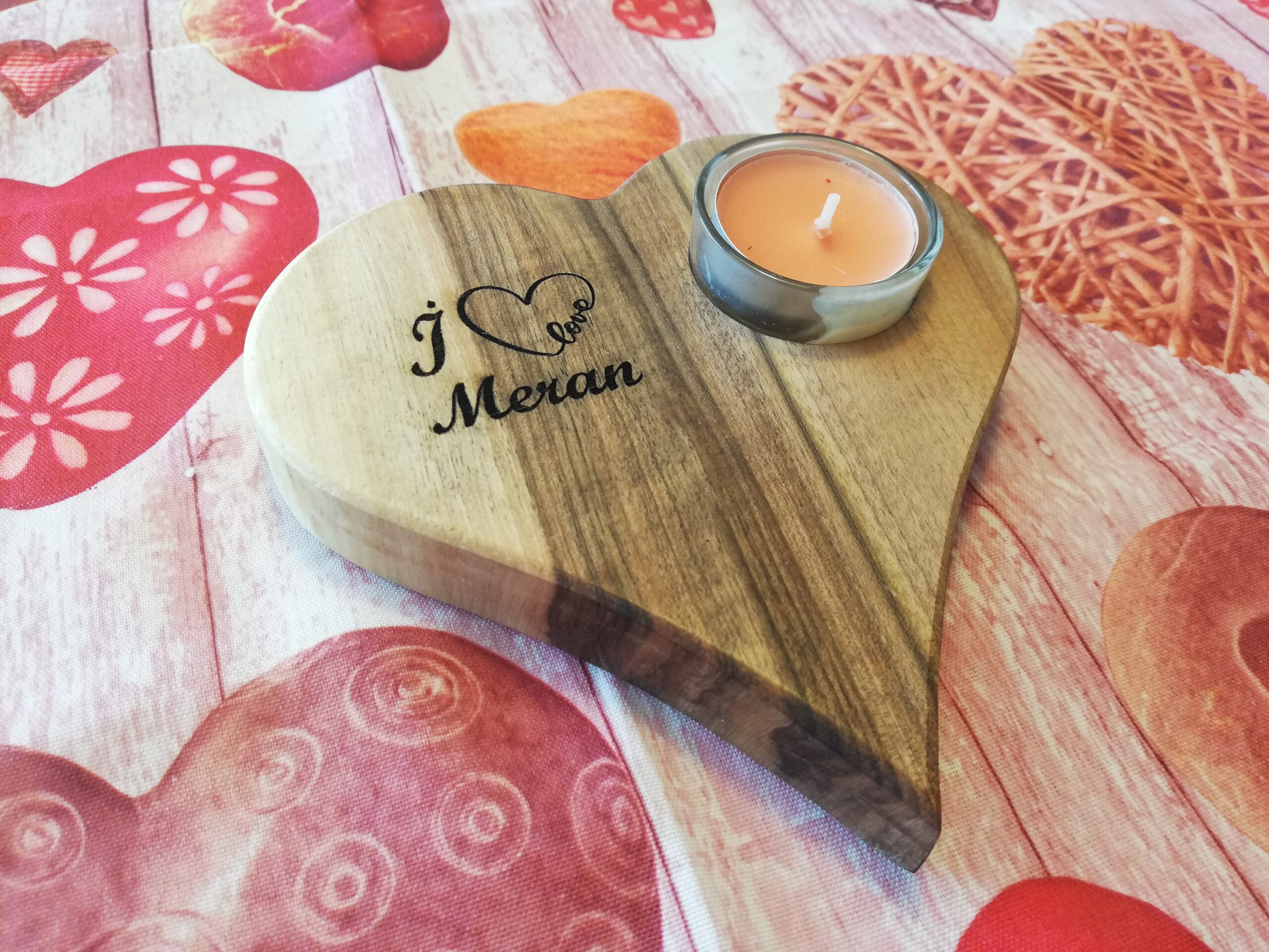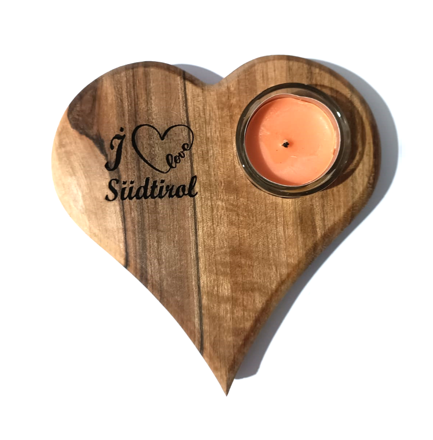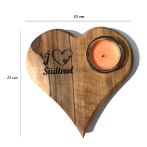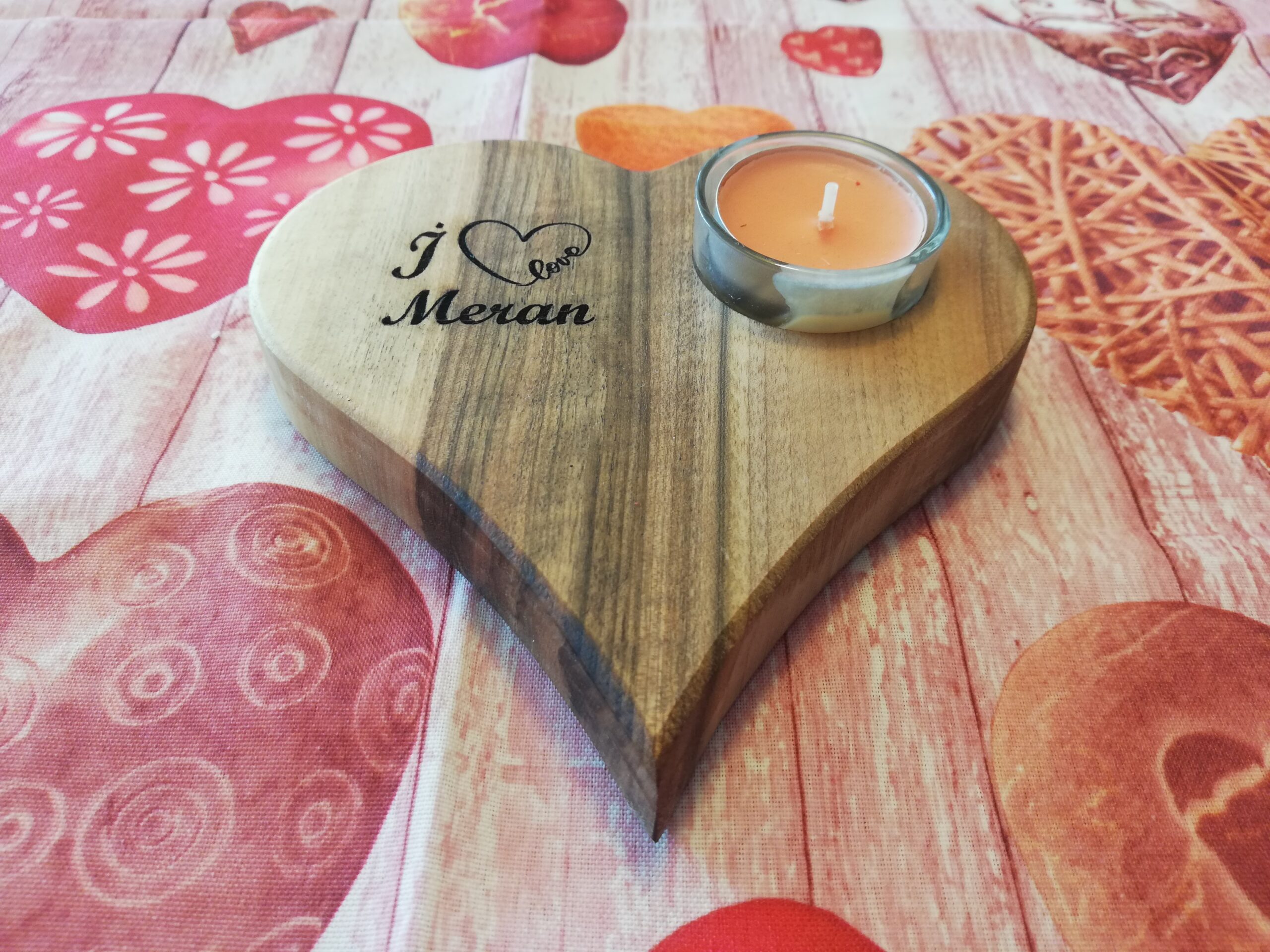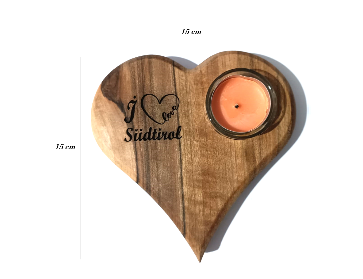 Mod. Herz „I Love…“, sottocandela (con 1 candela e 1 bicchierino in vetro) in legno massello di alta qualità, fatto a mano.