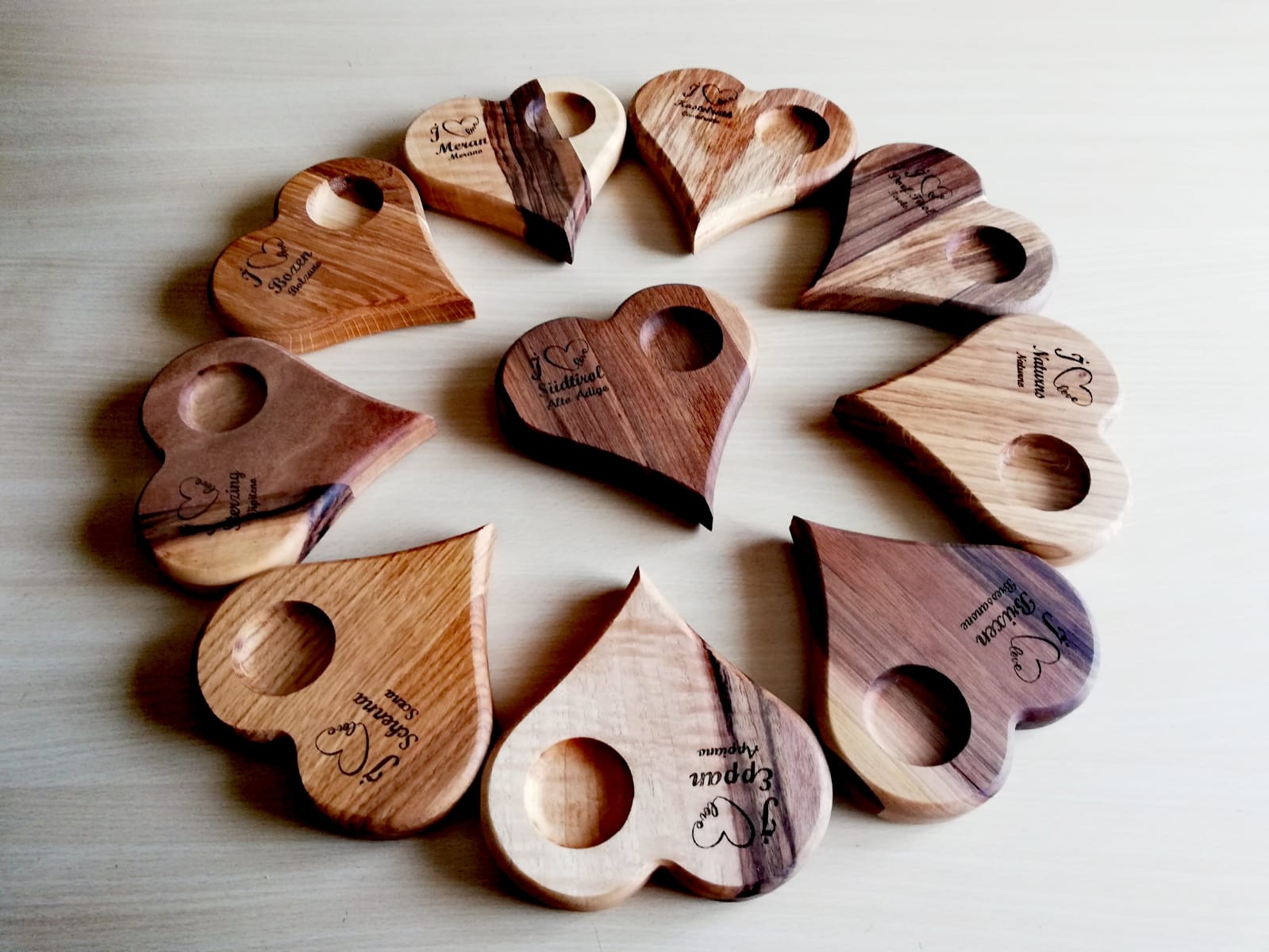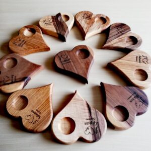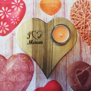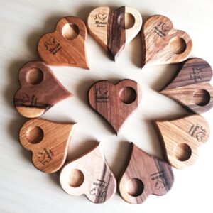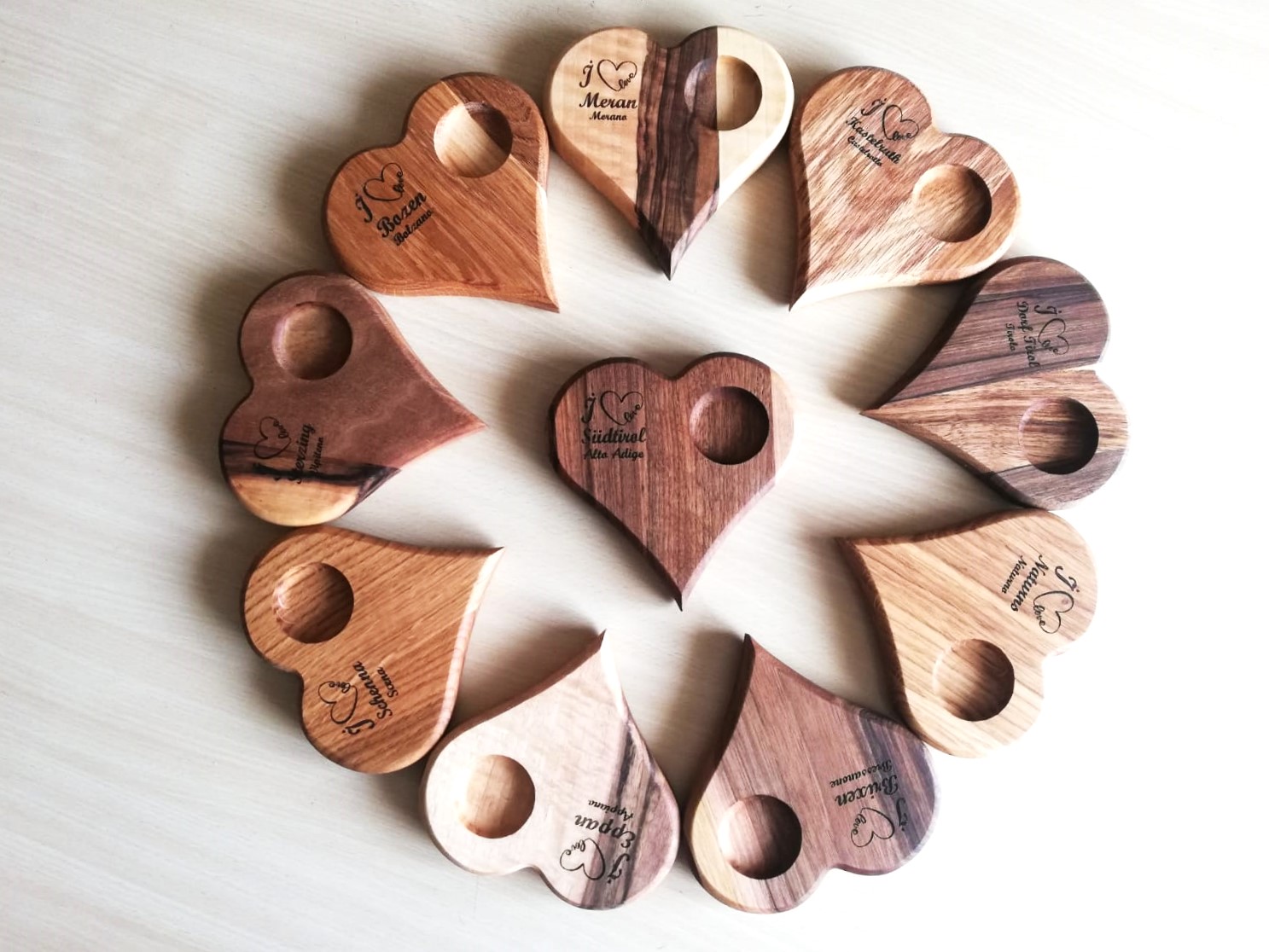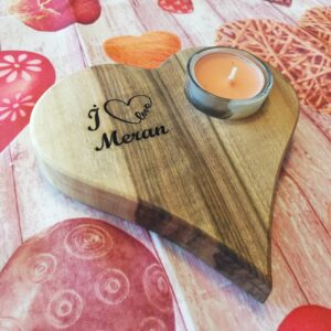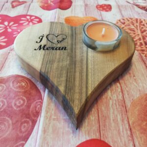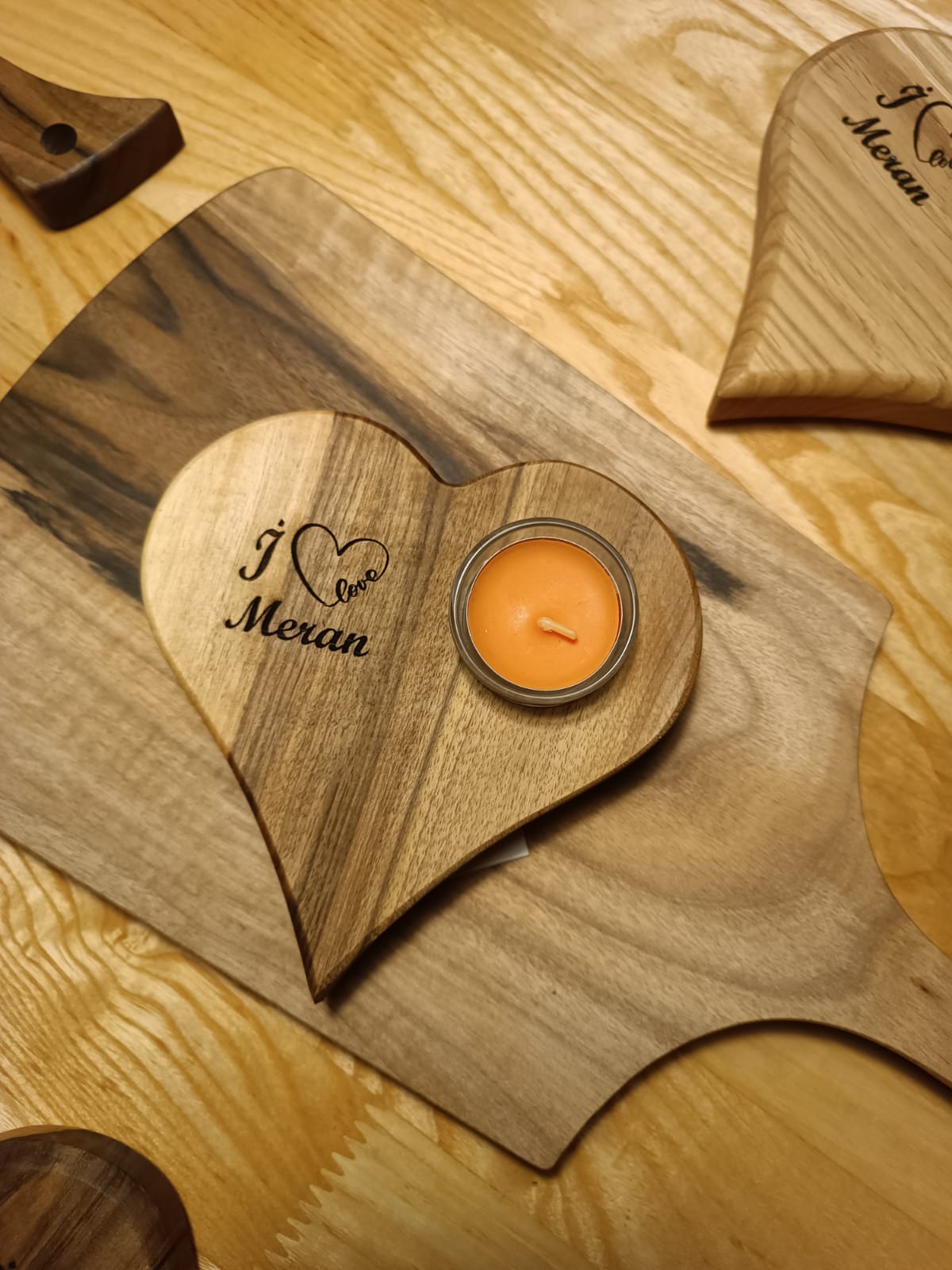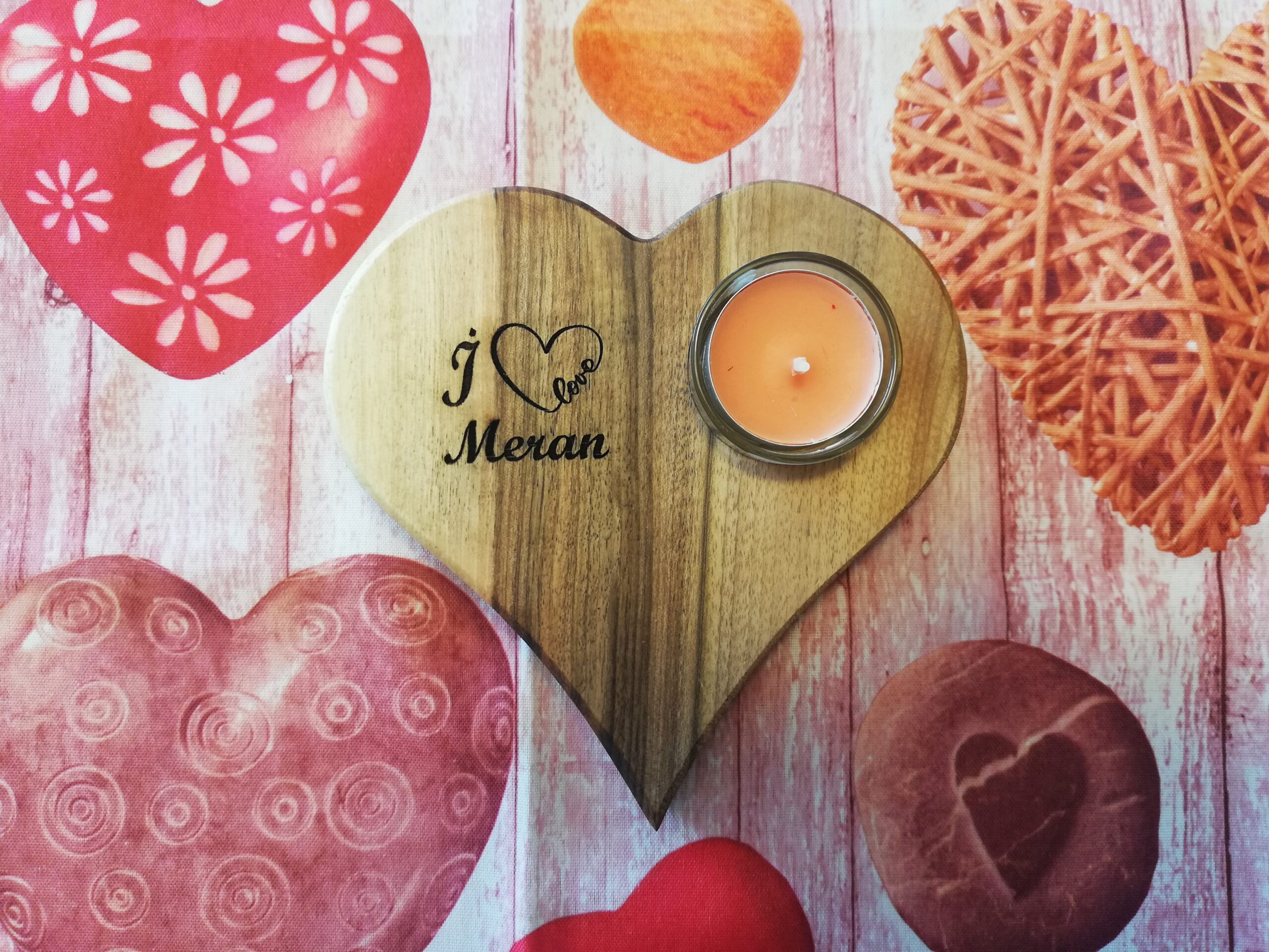 Mod. Herz „I Love…“, sottocandela (con 1 candela e 1 bicchierino in vetro) in legno massello di alta qualità, fatto a mano.