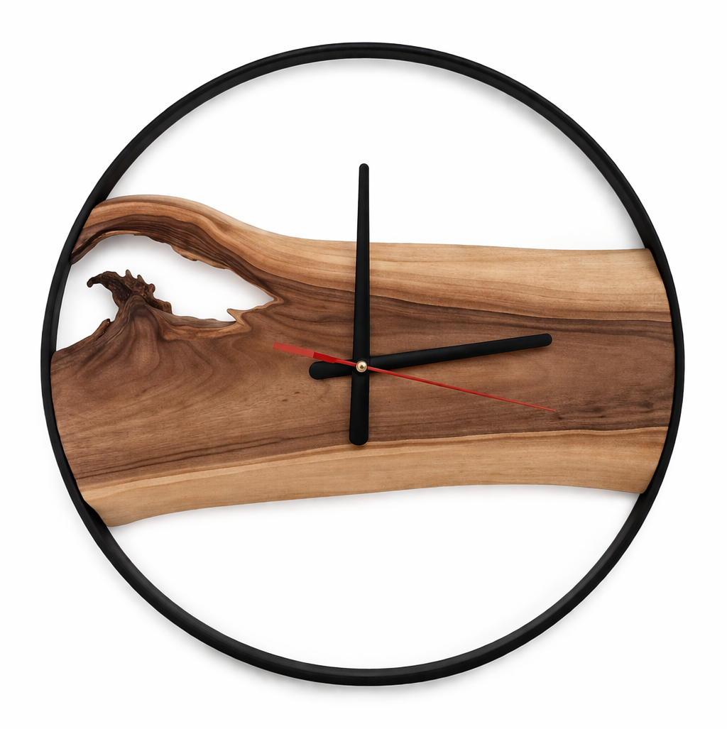 Hodiny, masivní dřevo, kovový rám, ruční výroba