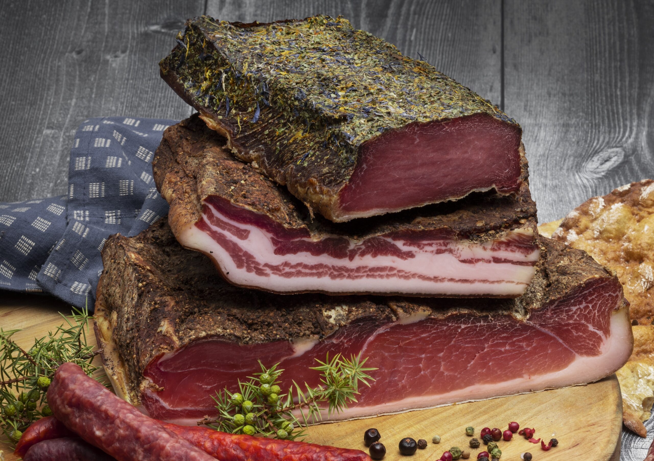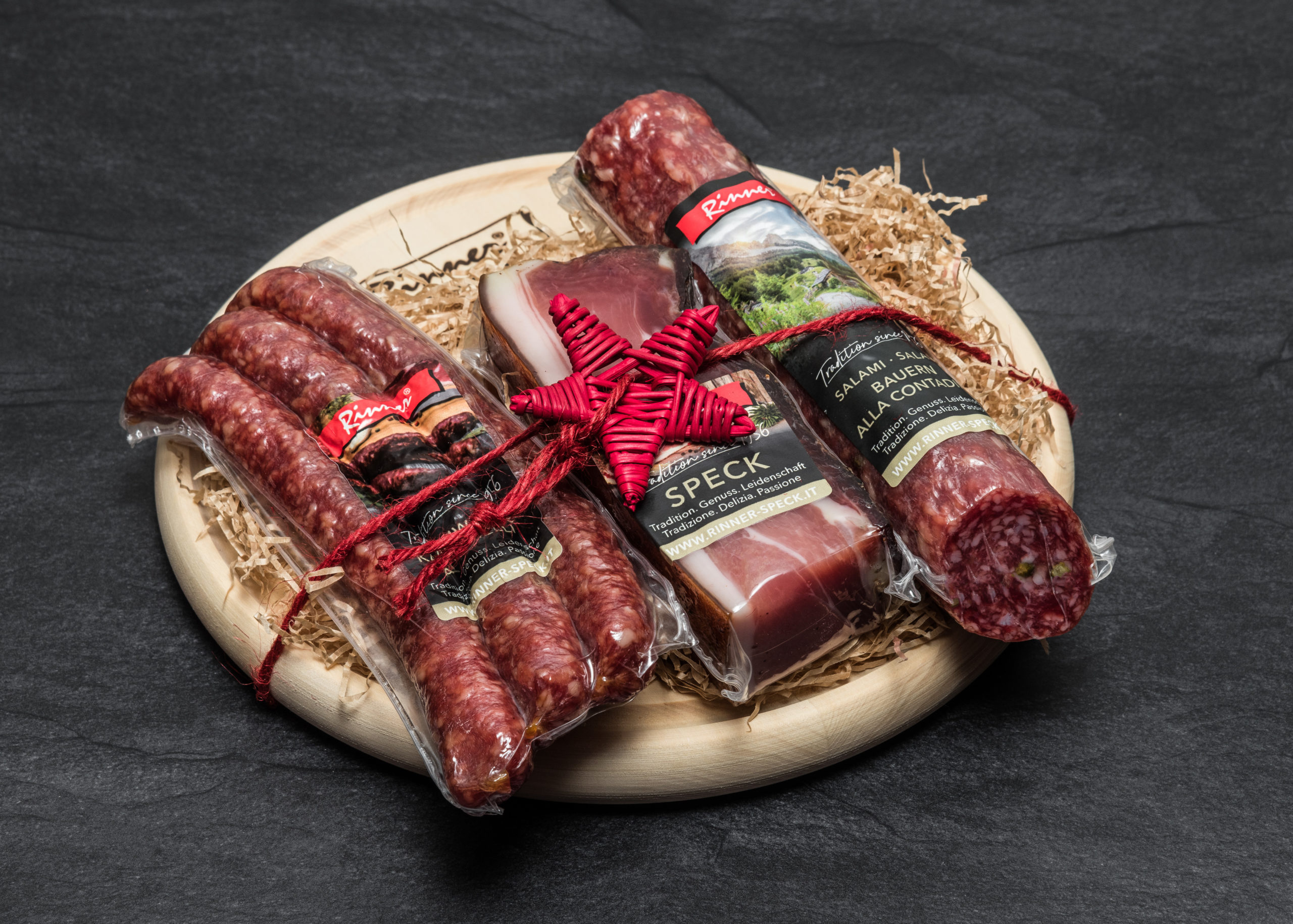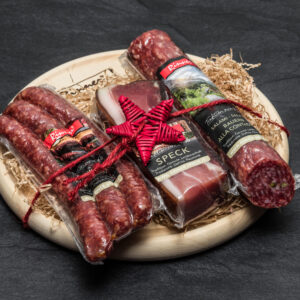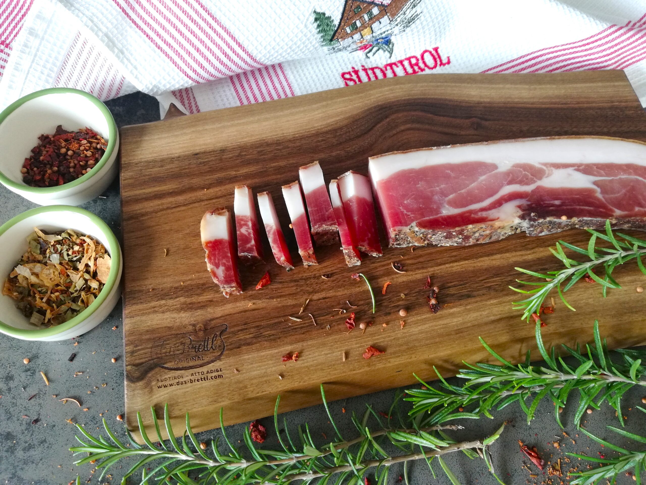Per la produzione del nostro Speck Alto Adige utilizziamo solo pregiate sottofese di maiale. Strofinate con una delicata miscela di sale, spezie ed erbe aromatiche, le baffe restano per 14 giorni nella camera di salmistratura, prima di venire affumicate con legno di faggio ed essere successivamente conservate nelle celle di stagionatura per almeno 7 mesi.