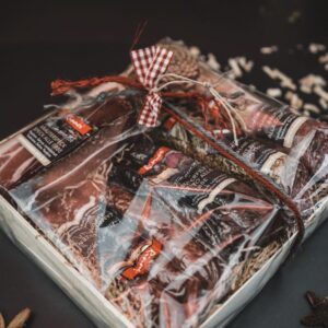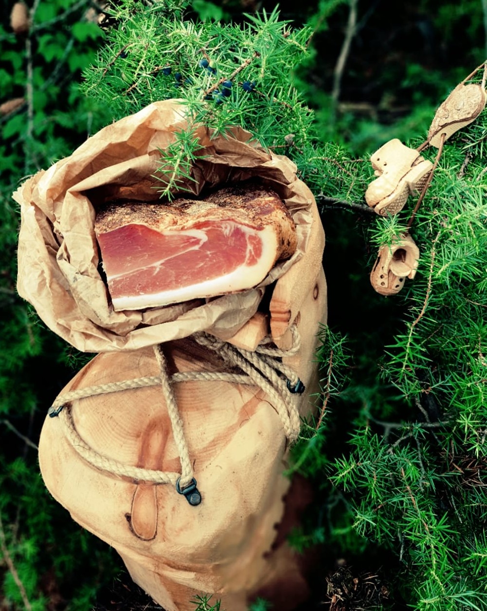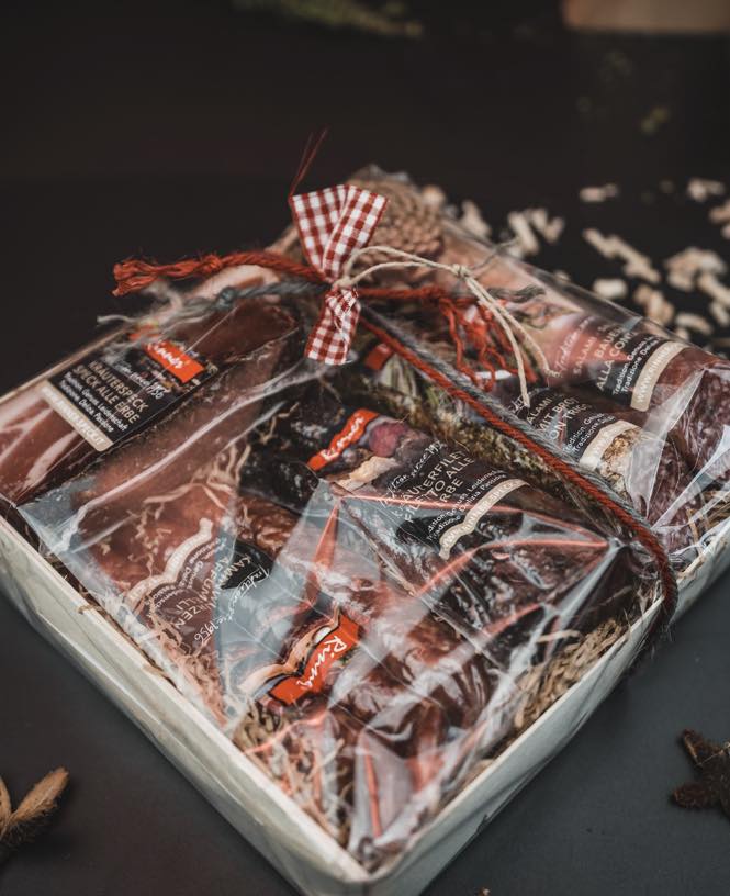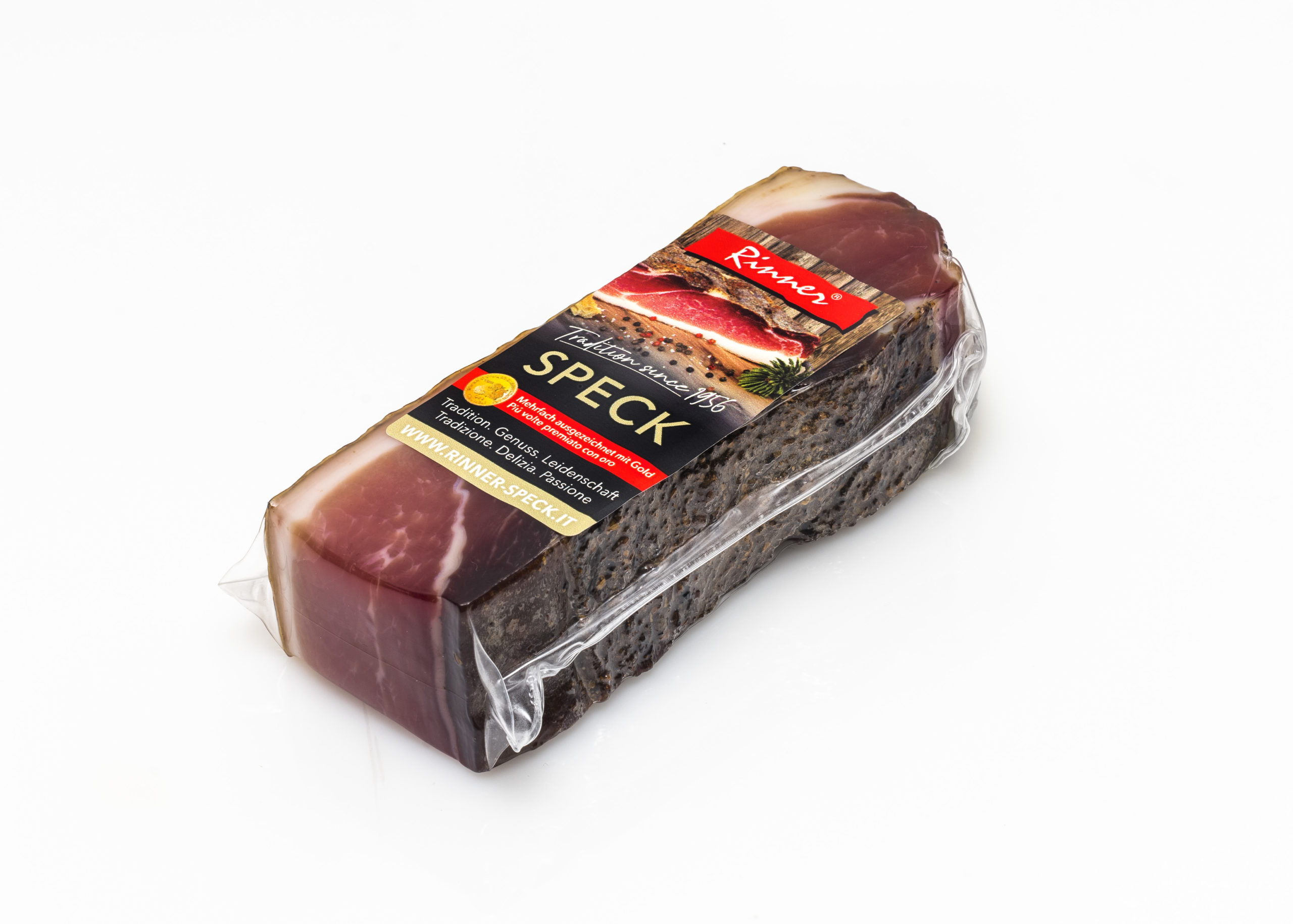 Per la produzione del nostro Speck Alto Adige utilizziamo solo pregiate sottofese di maiale. Strofinate con una delicata miscela di sale, spezie ed erbe aromatiche, le baffe restano per 14 giorni nella camera di salmistratura, prima di venire affumicate con legno di faggio ed essere successivamente conservate nelle celle di stagionatura per almeno 7 mesi.