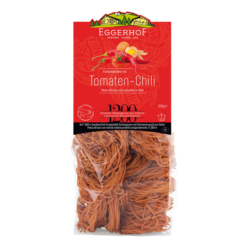 Obsah balení vsypte do cca 3 litrů vroucí osolené vody (2 lžíce hrubé soli), promíchejte a vařte přibližně 7 minut do požadované tuhosti (al dente). Poté sceďte. Na pánvi rozehřejte máslo, přidejte uvařené tagliatelle s rajčaty a chilli a dochuťte solí a čerstvě mletým pepřem. Dobrou chuť!
